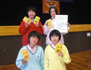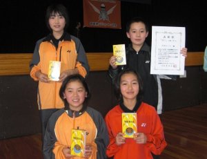 | 1 | 西池ジュニアB 宮崎 詩織E 多田 智子E・桑山 佳澄D 道下 咲紀E | 3 | (S2-0 D1-0) 2(15- 1 15- 3)0 2(15-10 15-11)0 2(15- 5 15- 6)0 | 0 | 生目南バドミントン 大塚 智弘D 今藤 さやかE・河野 莉子D 古瀬 帆乃華D |